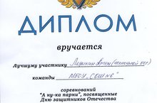 Поздравляем Ладыкина Артема, ставшего лучшим в челночном беге в муниципальных соревнованиях "А ну-ка, парни!", проводимого в предверии Дня защитника Отечества на базе МФЗ "Ярыш". Организаторы мероприятия - ДЮСШ "ДИНАМО".