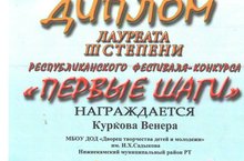 Полздравляем Куркову Венеру, занявшую третье место в Рспубликанском фестивале - конкурсе "Первые шаги" в номанации вокал - соло в средней группе.