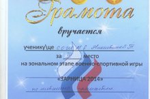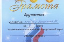 Поздравляем Никитину татьяну, учащуюся 9 Б кл., занявшую II место в зональном этапе военно -спортивной игре "Зарница" в беге на 60 метров.