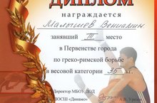 Пздравляем Малышева Вениамина, учащегося 7 "Б" класса , занявшего III место в Первенстве города по греко -римской борьбе в весовой категории 35 кг.
