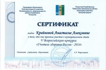 Наш учитель физической культуры Крайнова Анастасия Алексеевна приняла участие в муниципальном этапе V Всероссийцского конкурса "Учитель Здоровья России- 2014 года" Крайнова Анастасия Алексеевна - творческий, инициативный педагог, владеющий научно- теоритическими основами преподавания уроков физической культуры . Владеет методикой преподавания и анализа учебно -методической работы по физкультуре. Проводит уроки на высоком организационном и научно - методическом уровне с максимальной двигательной и моторной плотностью, которые содействуют укреплению здоровья, хорошей физической подготовке школьников, строятся на основе принципов демократизации, педагогики сотрудничества. Крайнова А.А .награждена сертификатом участника конкурса.