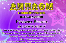 - Диплом высшей степени за лучшую работу - Русскова Рената( учащаяся 5 Б класса) - название работы "В лазурной акварели моря...", детское объединение "Компьютерная графика", педагог Сычева Л.Н.