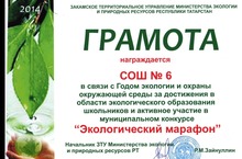 За активное участие во всех мероприятиях МБОУ "СОШ №6" НМР РТ награждена почетной грамотой Закамского территориальнго управления Министертсва экологнии и природных ресурсов Республики Татарстан.