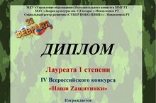 Поздравляем лауреатов I степени IV Всероссийского конкурса "Наши Zащитники": Клюсову Снежану (7Б) в номинации "Изобразительное искусство" (учитель Глухарева Ирина Сергеевна), педагога-библиотекаря Савельеву Наталью Денисовну в номинации "Праздничное оформление к 23 февраля", учителя математики Миннегалиеву Раилю Хамитовну в номинации "Методическая копилка", Файзуллина Марселя (6В) за видеодекламацию стихотворения Мусы Джалиля (учитель русского языка и литературы Сергеева Ирина Юрьевна). Конкурс организован Управлением образования ИК Менделеевского муниципального района, МАУ "Дворец культуры им. С. Гассара" г. Менделеевск РТ.