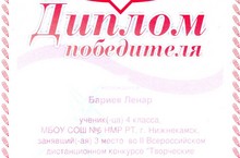 Ученик 4 класса Бариев Ленар награждён Дипломом победителя за 3 место во II Всероссийском дистанционном конкурсе "Творческие заморочки". Поздравляем!!!