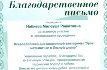 Учитель начальных классов Набиева Милеуша Рашитовна награждена Благодарственным письмом за активное участие в организации и проведении Всероссийской дистанционной викторины "Урок математики в Лесной школе".