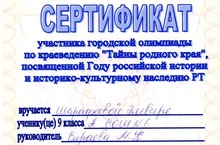 Сертификатами участников городской олимпиады по краеведению "Тайны родного края" , посвященной Году российской истории и историко-культурному наследию РТ, награждены ученики 9 класса Зубов Евгений и Шарафеева Эльвира.