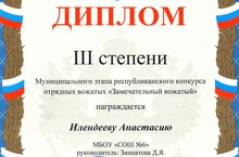 Ученица 8Б класса Илендеева Анастасия награждена Дипломом III степени муниципального этапа республиканского конкурса отрядных вожатых "Замечательный вожатый".