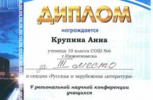 Дипломом Казанского Федерального Университета (г.Набережные Челны) награждена ученица 10 класса нашей школы Крупина Анна за III место в секции "Русская и зарубежная литература" V региональной научной конференции учащихся. Научный руководитель - учитель русского языка и литературы Гимадеева Ляля Мунировна - награждена Благодарственным письмом за подготовку участника конференции.