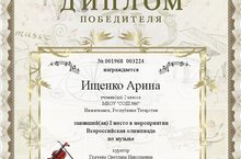 Поздравляем Ищенко Арину (2 Акласс, педагог Грачева С.Н.) - победителя Всероссийской олимпиады по музыке Центра дистанционных мероприятий "Мир таланта".