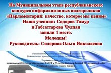 В рамках парламентского урока 2020 , ученики нашей школы Сидоров Тимур и Габсатарова Чулпан стали победителями конкурса информационного видеоролика «Парламентарий: качество. которое мы ценим»