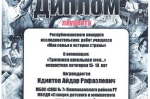 Идиятов Айдар стал лауреатом Республиканского конкурса исследовательских работ учащихся "Моя семья в истории страны" в номинации "Тропинка школьная моя"