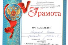 В рамках зонального этапа муниципального смотра - конкурса строя и песни, посвященного дню защитника Отечества и приуроченного 30 - летней годовщине вывода войск из Афганистана, прошло тестирование на знание истории. Гарипов Раиф ученик 9а класса (педагог Сидорова О.Н) стал обладателем диплома 3 степени. Он ежегодно подверждает звание "Лучший знаток истории Отечества"
