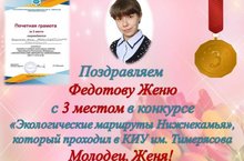 Ученица 8 а класса Федотова Женя стала участником конкурса в рамках реализации гранта президента Российской Федерации "Экологические маршруты Нижнекамска" ,который проходил КИУ им. Тимирясова г. Нижнекамск. Женя стала обладателем диплома 3 степени (рук. Сидорова О.Н.) Молодцы!!!