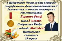 Гарипов Раиф стал призером в региональной олимпиаде по истории, которая проходила в г. Наб-Челны. В этой олимпиаде принимали учащиеся 8 а класса и Кутдусов Дамир и Никитин Алеша, они вошли в пятерку лучших. Дамиру не хватило 2 баллов, до призера. Молодцы,ребята! (подготовила уч-ся: педагог Сидорова О.Н.)