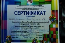 24 марта в посёлке Камские Поляны, состоялись I муниципальные соревнования для учащихся школ по спидкубингу «Талант в кубе», посвященные подготовке и проведению 100-летия образования ТАССР. Нашу школу представлял ученик 5А класса Аслямов Марат. Среди учеников средней группы, где участников более 50 человек, в дисциплине скоростная сборка кубика Рубика 3*3, Марат принял участие с результатом 44,793с.