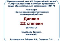 Сидоров Тимур ученик 6 а класса, награжден дипломом 3 степени муниципального этапа Всероссийской акции "Спорт- альтернатива пагубным привычкам", среди образовательных организаций НМР РТ. Номинация "Организация профилактической волонтерской работы" Поздравляем!