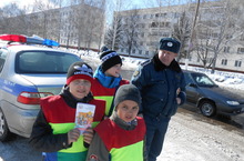 Листовки по профилактике дорожно-транспортных проишествий вручают ЮИДовцы 3 В класса Юртаев Ваня, Богомазов Виталик и Сметанин Лев.