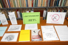 В настоящее время экстремизм и терроризм являются реальной угрозой национальной безопасности Российской Федерации. Экстремизм — это исключительно большая опасность, способная расшатать любое, даже самое стабильное и благополучное, общество. В рамках месячника «Экстремизму —нет» в школьной библиотеке была оформленная книжная выставка, которая поможет узнать о том, что такое терроризм, каковы его цели, правила поведения в условиях террора. На выставке представлены памятки, листовки, книжные закладки «Рекомендации гражданам по действиям при угрозе совершения террористического акта», «Как вести себя во время теракта», «Дети против терроризма».