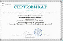 В рамках предметной недели истории и обществознания, в школе прошли онлайн - уроки финансовой грамоты. Ребята и учителя получили сертификат