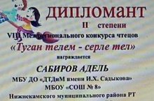 Поздравляем ученика нашей школы Сабирова Аделя - победителя II степени в VIII Межрегиональном конкурсе чтецов «Туган телем - серле тел».