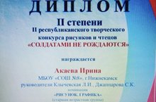 Ученица 10 класса Акаева Ирина заняла 2 место во II Республиканском творческом конкурсе рисунков и чтецов «Солдатами не рождаются»! Руководители Клычевская Л.И., Брылёва А.Л. Поздравляем!