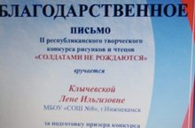 Свидетельство участника: Фотоконкурс "Мир глазами ребёнка", номинация "Лицо организации" - Ефимова Ксения, руководитель Джаппарова С.К.; Мамедова Аида, руководитель Абызова Е.А., номинация "Объект заботы" - Назмутдинова Аделина, руководитель Джаппарова с .К. Конкурс изобразительного искусства "Юные чудотворцы" - Иванова Анастасия, руководитель Яковлева Е.Н.; Кузьмина Эвелина, Самигуллин Данир, руководитель Пащенко Ю.П.; Фатхуллина Розалия, руководитель Шайдуллина В.И.; Хуснутдинов Булат, руководитель Ахметова Г.Н.; Димиева Ильдана, руководитель Чумакова О.Н.
