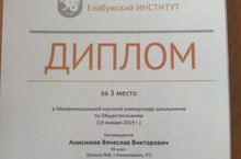 Ученик 9б класса Анисимов Вячеслав занял 3 место в Межрегиональной научной универсиаде школьников по обществознанию, которая прошла на базе Елабужского института К(П)ФУ (рук-ль: Ахмерова Д.Р.).