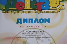 Ученица 9б класса Нуртдинова Алия заняла первое место в Международном фестивале "Детство без границ" в номинации "С юбилеем, Фестиваль!".