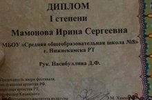 Ученице 10 класса Мамоновой Ирине вручили Диплом I степени Международного конкурса речевого и вокального искусства "Илхамият". Руководитель: Насибуллина Д.Ф.