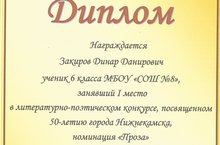 Поздравляем Закирова Динара, ученика 6-го класса (учитель: Исмагилова Р.И.), занявшего I место в муниципальном литературно-поэтическом конкурсе, посвященном 50-летию города Нижнекамска, в номинации «Проза» за авторское произведение «Я – Нижнекамец!»