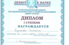 В VII Республиканском конкурсе «Дебют в науке» Дипломом I степени награждена ученица 6 класса Булаева Снежана за исследовательскую работу в секции «Мои первые научные опыты» (рук-ль: Брылева А.Л.).