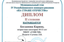 Богданова Карина награждена Дипломом II степени в Республиканском конкурсе рисунков «На страже Отечества».