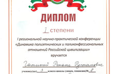 Дипломом I степени награждена Гатина Рената - ученица 3 класса нашей школы (руководитель: Яковлева Е.Н.) на I региональной научно-практической конференции «Динамика полиэтнических и поликонфессиональных отношений Российской цивилизации».