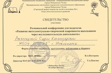 28 ноября 2015 года в г.Набережные Челны состоялся очный тур Региональной конференции для педагогов «Развитие интеллектуально-творческой одаренности школьников через исследовательскую деятельность». Учитель русского языка и литературы Джаппарова С.К. приняла участие в работе конференции. Ее выступление на тему «Проектно-исследовательская деятельность на уроках русского языка и литературы» опубликовано в сборнике материалов Региональной научно-практической конференции для педагогов.