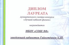 Дипломом лауреата награжден заведующий кабинетом физики МБОУ "СОШ № 8" Гайнутдинов Хамит Шайхуллович в рамках муниципального смотра-конкурса "Лучший кабинет физики".