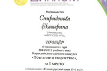 Призером Всероссийского конкурса «Познание и творчество» стала ученица 6-го класса Спиридонова Екатерина (руководитель: Сычева Л.В.). Она получила I место в номинации «Я знаю русский язык» (5-6 кл.)