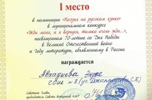 Поздравляем ученицу 10 класса Авхадееву Эндже (руководитель: Джаппарова С.К.), занявшую I МЕСТО в номинации "поэзия на русском языке" в муниципальном конкурсе "Жди меня и я вернусь, только очень жди...", посвященном 70-летию со Дня Победы в Великой Отечественной войне и Году Литературы.