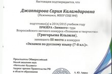 Учащаяся 7-го класса нашей школы Григорьева Ильзиля (руководитель: Джаппарова С.К.) стала призёром "Зимнего" тура Всероссийского заочного конкурса "Познание и творчество" (г. Обнинск) и заняла III место в конкурсе "Экзамен по русскому языку (7-8 кл.)"