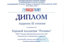 Хоровой коллектив "РОСИНКА" и руководителя - Короткова Анатолия Ивановича с наградой. Дипломом III степени получили за участие в детском вокально-хоровом конкурсе "СЕРЕБРЯНЫЙ КОЛОКОЛЬЧИК", посвященный 70-летию Победы в Великой Отечественной войне.