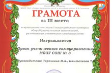 Грамотой за 3 место в муниципальном этапе I всероссийского конкурса общеобразовательных организаций, развивающих ученическое самоуправление награждается Орган ученического самоуправления МБОУ СОШ №8. Руководители: Торошина И.А., Пантелеева Т.Н.