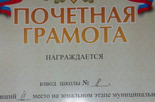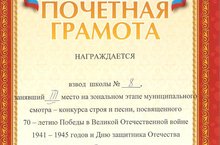 Почетной грамотой награжден взвод нашей школы 4-го класса (кл.руководитель: Щетинина Н.С.), занявший II место на зональном этапе Муниципального смотра - конкурса строя и песни, посвященного 70-летию Победы в Великой Отечественной войне и Дню Защитника Отечества.