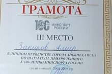 10 апреля учащийся 7А класса МБОУ «СОШ №9» НМР РТ Закиров Амир занял III место в личном первенстве города Нижнекамска по шахматам, приуроченного к 100 - летию минспорта России. Поздравляем ! Молодец ! Так держать !