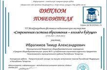 С 27 марта по 20 апреля педагог - организатор МБОУ "СОШ №9" НМР РТ Ибрагимов Тимур Александрович участвовал во Всероссийских конкурсах профессионального мастерства работников образования «Современная система образования - взгляд в будущее» и «Копилка педагогического мастерства» за участие в которых он получил диплом I Степени и диплом победителя за конкурсную работу: Патриотический конкурс на лучшее исполнение гимнов Российской Федерации и Республики Татарстан. Поздравляем ! Гордимся ! Так держать !