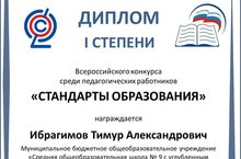 Педагог - Организатор МБОУ "СОШ №9" НМР РТ Ибрагимов Тимур Александрович участвовавший во всероссийском конкурсе среди педагогических работников «Стандарты образования» получил диплом I Степени за конкурсную работу: Патриотический конкурс на лучшее исполнение гимнов Российской Федерации и Республики Татарстан. Поздравляем ! Гордимся ! Так держать !