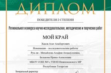 В сентябре – декабре 2022 г. проходил региональный конкурс научно-исследовательских, методических и творческих работ «Мой край». В нем принял участие учащийся 10 класса Хаков Азат с работой «Их помнят не только карельские сосны. Уроженцы Татарстана – воины 80-го пограничного отряда». Работа была посвящена татарстанцам - пограничникам, которые в 1941 г. грудью встали на защиту рубежей нашей Родины. Многие из них воевали под командованиемнашего земляка Героя Советского Союза Никиты Кайманова. Жюри под руководством доктора филологических наук, члена Союза российских писателей Рамиля Шевкетовича Сарчина высоко оценило вклад Азата Хакова в дело увековечения имен героев Великой Отечественной войны, удостоив работу дипломом второй степени. Как лучшая и оригинальная она будет опубликована в книге избранных работ «Моя Отчизна. Избранное». Исследованием руководили Белькова Ирина Алексеевна и Михайлова Альфия Ахмадулловна. -