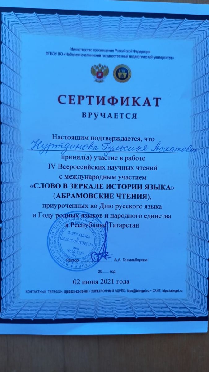 2 июня 2021года в Набережночелнинском государственном педагогическом университете прошла IV Всероссийская конференция с международным участием "Слово в зеркале истории языка" , приуроченное Году родных языков и народного единства в РТ. Учителя родного языка и родной литературы нашей школы Нуртдинова Г.А., Нуриева Э.Г., Салихова А.Т. принимали участие в данной конференции.