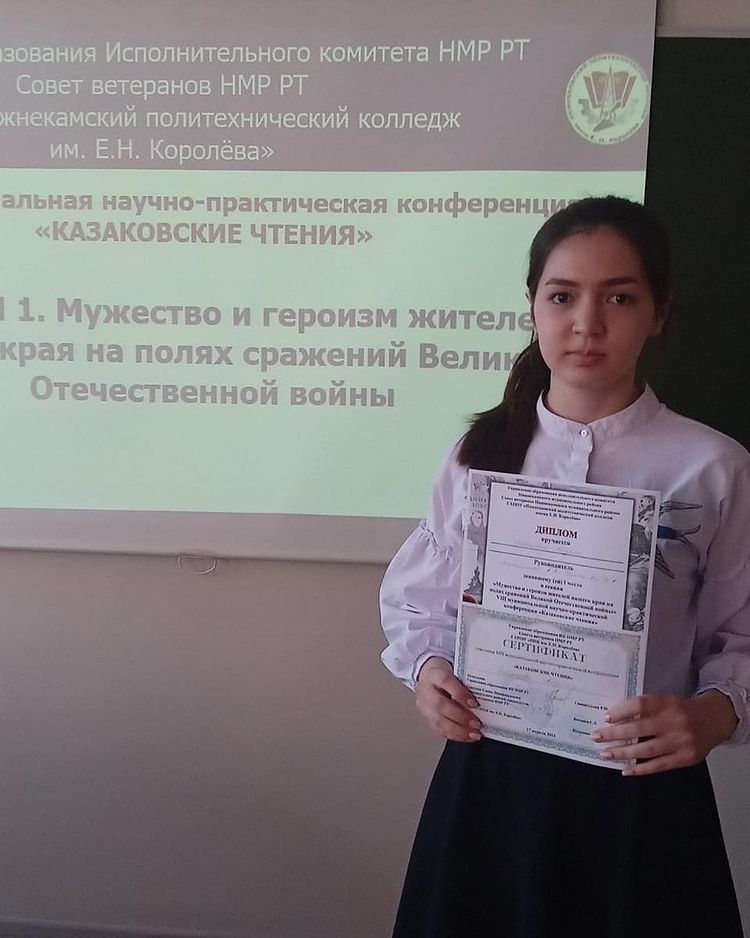 17 апреля с.г. на 8 - й научно- практической конференции " Казаковские чтения" учащаяся 10 класса Гайнеева Айзиля заняла первое место! Поздравляем её и её руководителей А. А. Михайлову и И.А. Белькову -