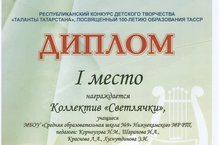 Поздравляем коллектив "Светлячки", занявший 1 место в Республиканском конкурсе детского творчества "Таланты Татарстана", посвященный 100-летию образования ТАССР. Педагоги: Корноухова Н.М., Шарапова И.А., Краснова Л.А., Хуснутдинова Э.И.