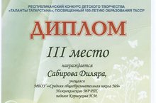 Поздравляем Сабирову Диляру, занявшую 3 место в Республиканском конкурсе детского творчества "Таланты Татарстана", посвященный 100-летию образования ТАССР. Номинация "Такие разные стихи" Педагог Корноухова Н.М.